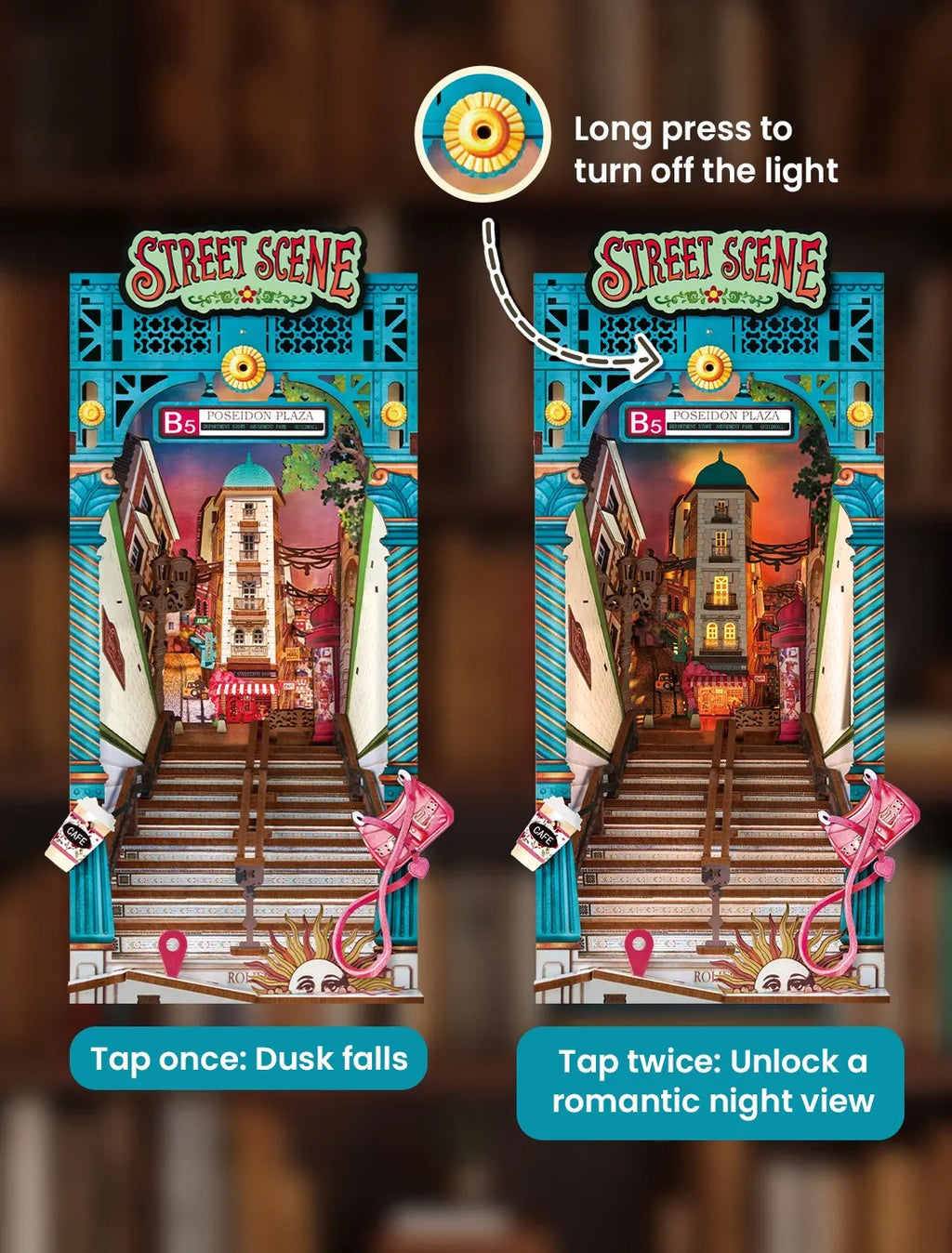 This is Street Scene, a model kit that allows you to build a charming street scene with steps, shops and lots of little details, all enhanced with the dusk effect lighting.